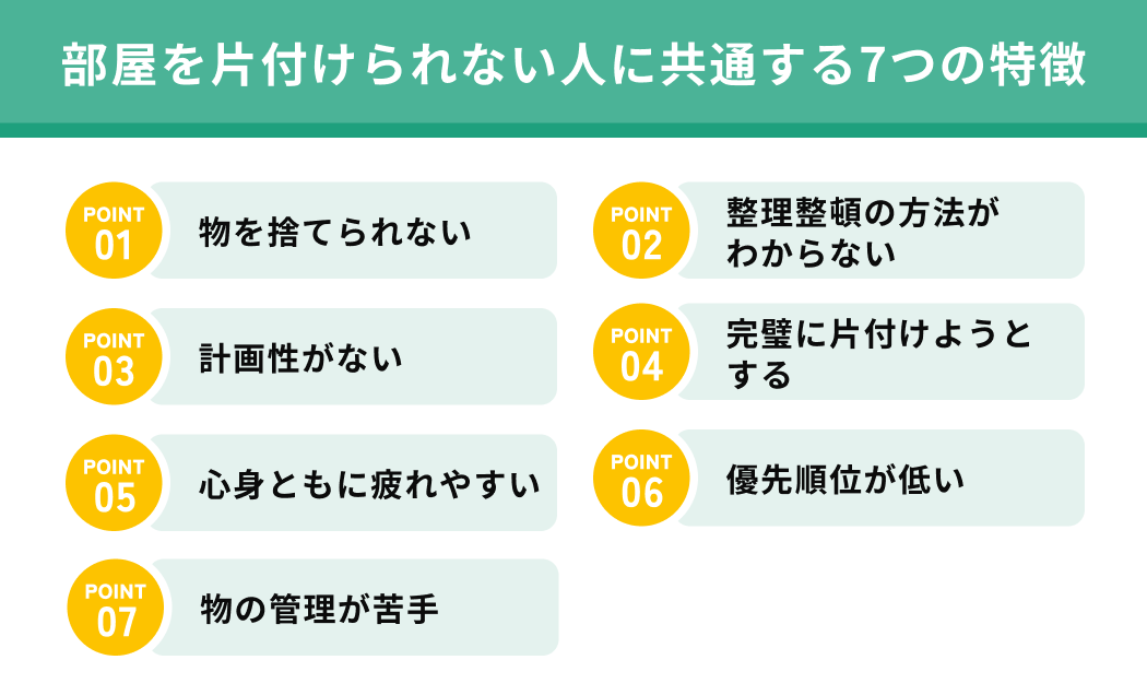 部屋を片付けられない人に共通する特徴は、主に以下の7つです。